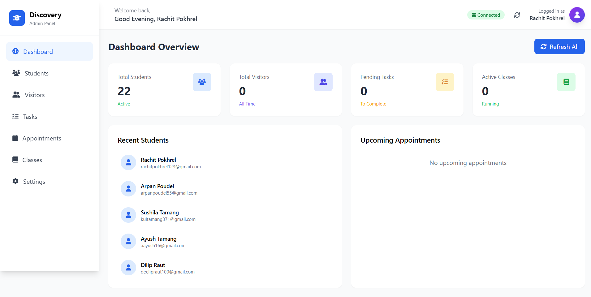 A comprehensive admin dashboard for managing student applications, tracking tasks, and scheduling appointments. Features include student data management, application processing workflow, task assignment system, and appointment scheduling. Built with a modern purple gradient UI for an intuitive user experience.
