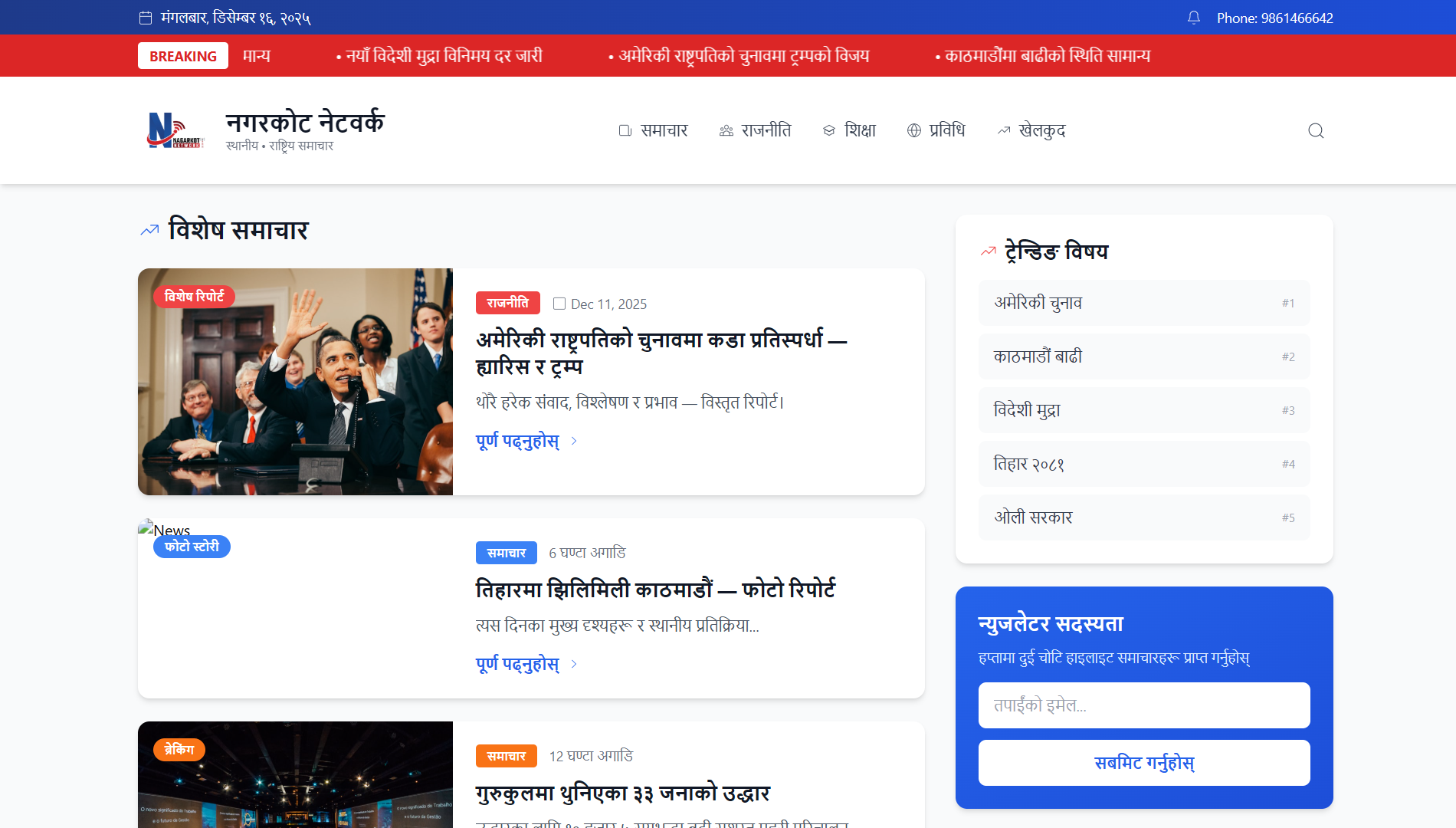 A local news platform delivering latest news and updates in Nepali. Features comprehensive news coverage across politics, education, technology, and sports. Includes breaking news alerts, trending topics sidebar, newsletter subscription, and responsive design for seamless reading experience across all devices.